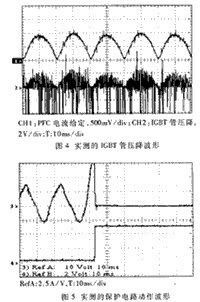 图5所示为IGBT过流时实际检测到的PFC电感中流过的电流及保护电路动作的波形。